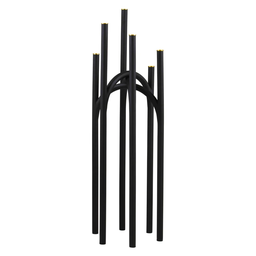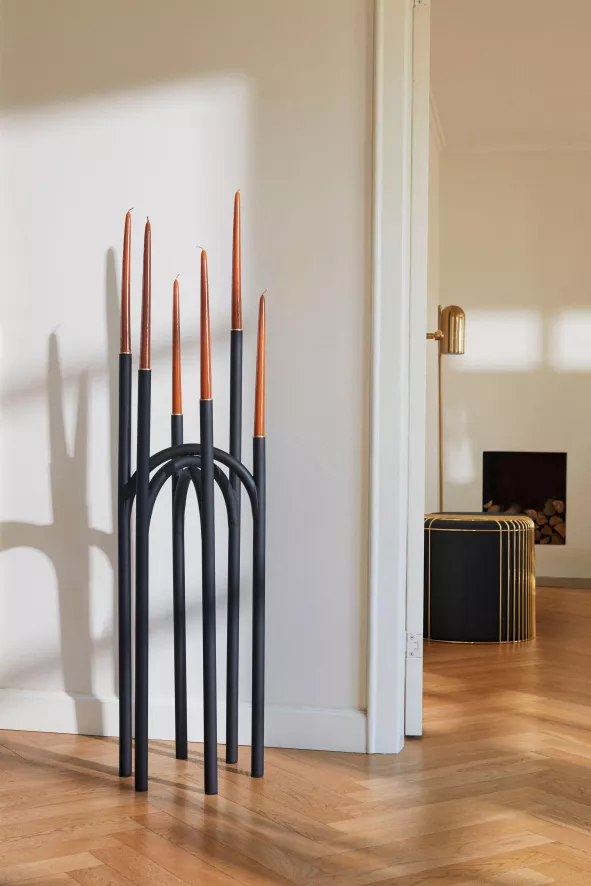 De Angui kandelaar large van het Deense merk AYTM heeft een lengte van 30 centimeter, een breedte van 26 centimeter en een hoogte van 92 centimeter. De kandelaar is gemaakt van ijzer en is ook verkrijgbaar in een kleinere maat.