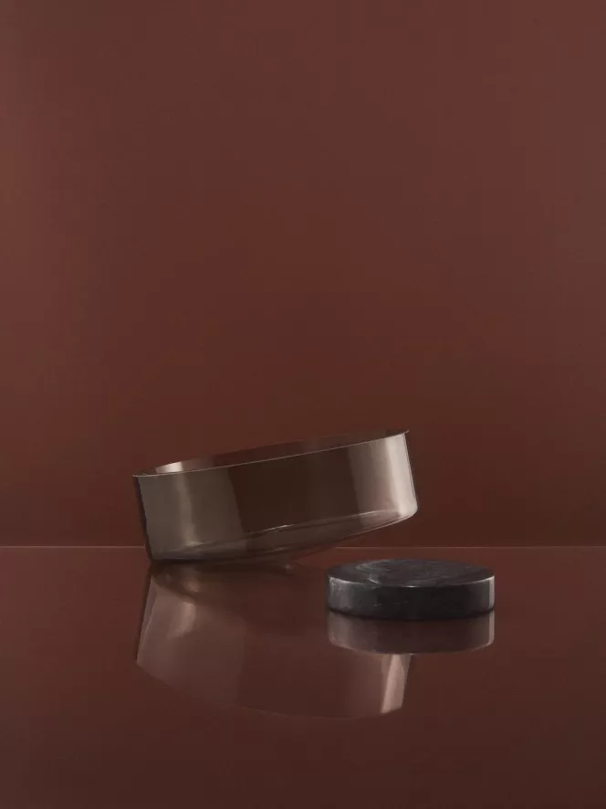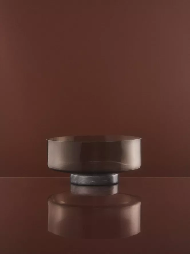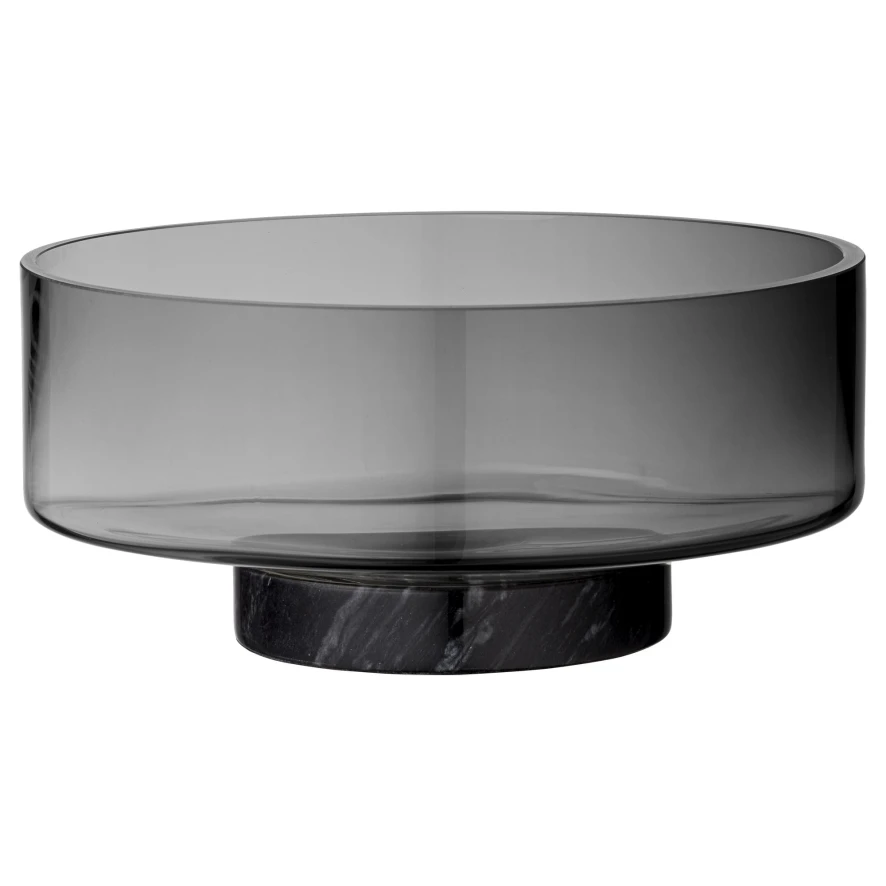 De Volvi schaal van AYTM heeft een diameter van 25 centimeter en een hoogte van 11 centimeter. De schaal is voor 80% gemaakt van kristalglas met een zwarte ondertoon. De schaal staat op een marmeren voet. De schaal en de voet zitten niet aan elkaar vast. De kom is bestendig tegen voedsel en de vaatwasmachine.