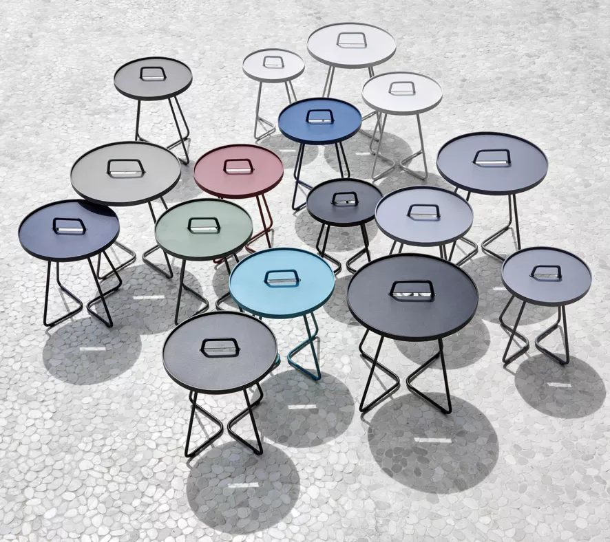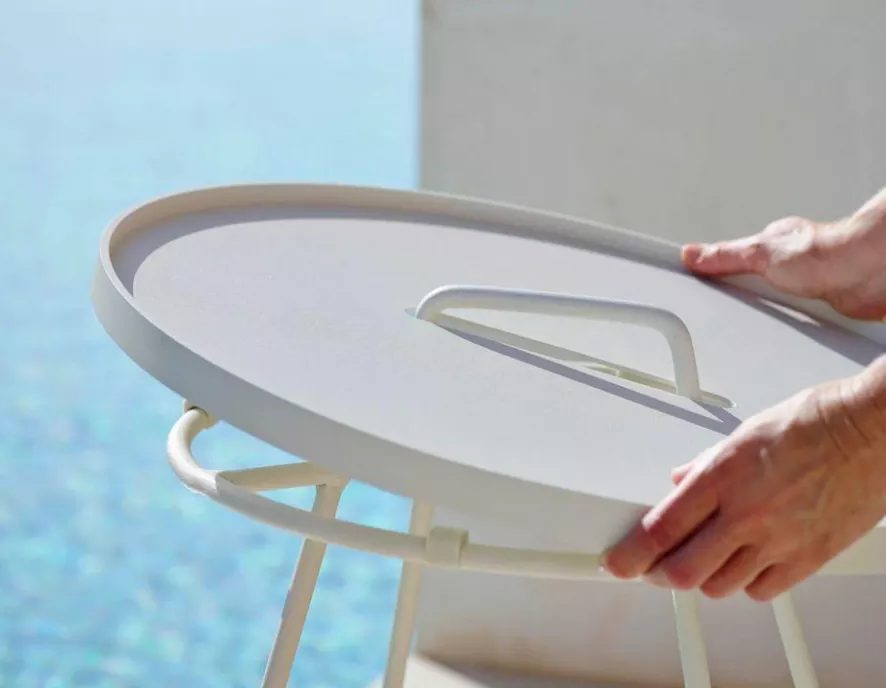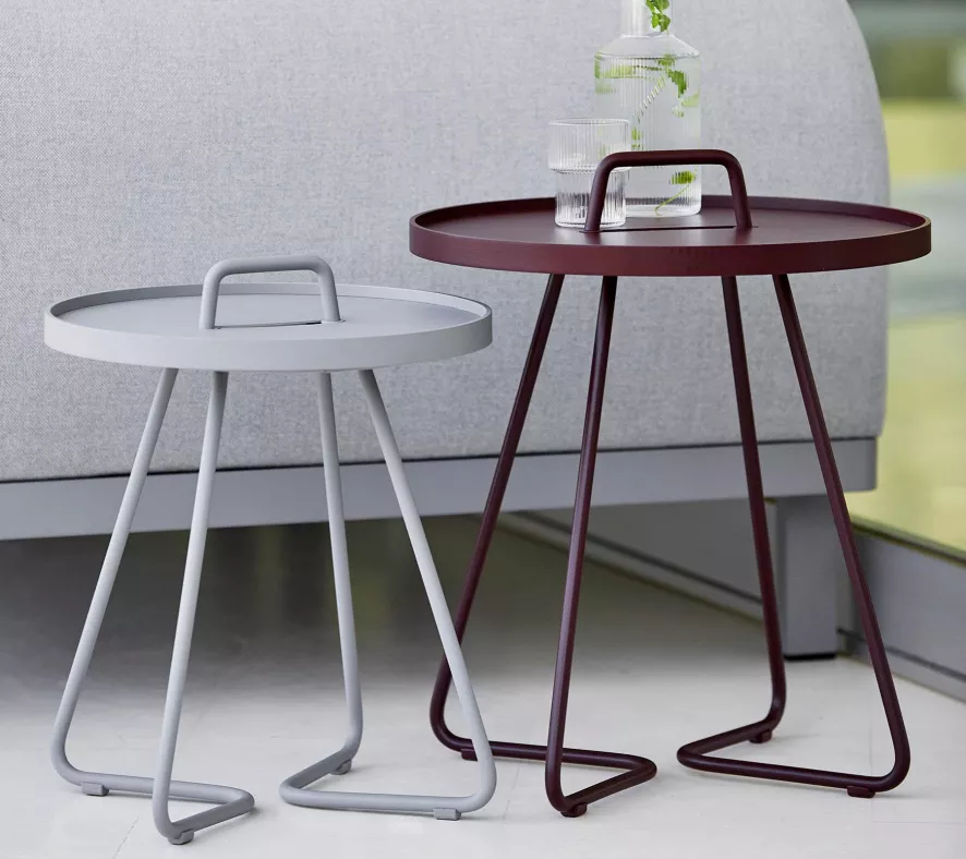 De On-the-move bijzettafel S van Cane-line, ontworpen door Strand + Hvass, heeft een diameter van 44 centimeter en een hoogte van 54 centimeter. Het tafeltje is gemaakt van gepoedercoated aluminium en weegt 2,91 kilogram. Het aluminium frame heeft minimaal onderhoud nodig en kan het hele jaar door buiten worden geplaatst. In de winter is het aan te raden het tafeltje te beschermen met een hoes of beschut neer te zetten. Het tafeltje is verkrijgbaar in verschillende kleuren.