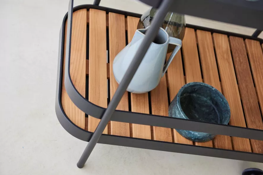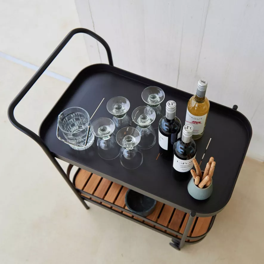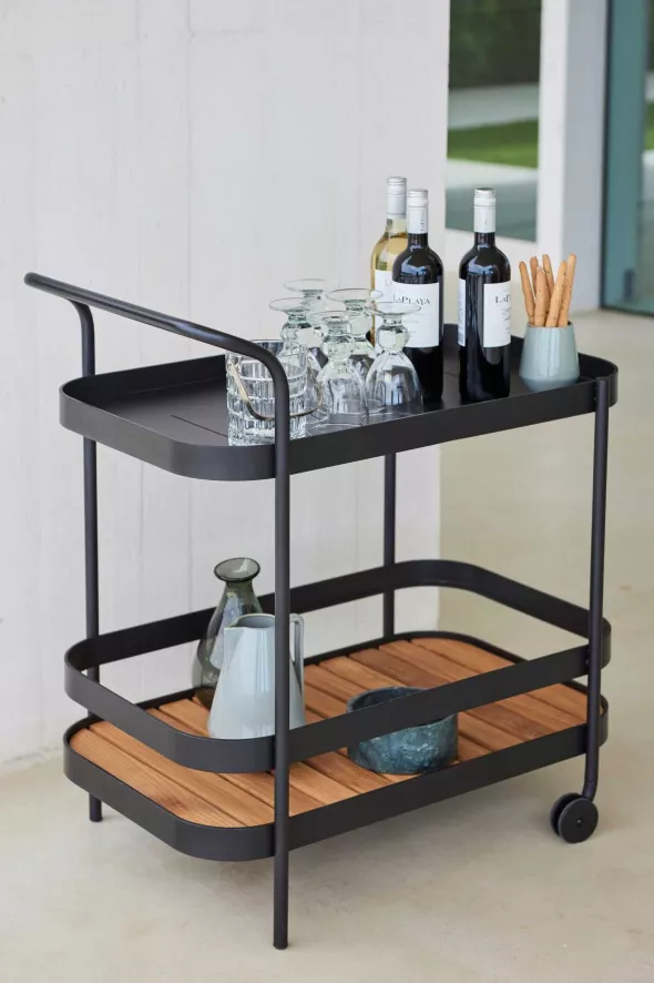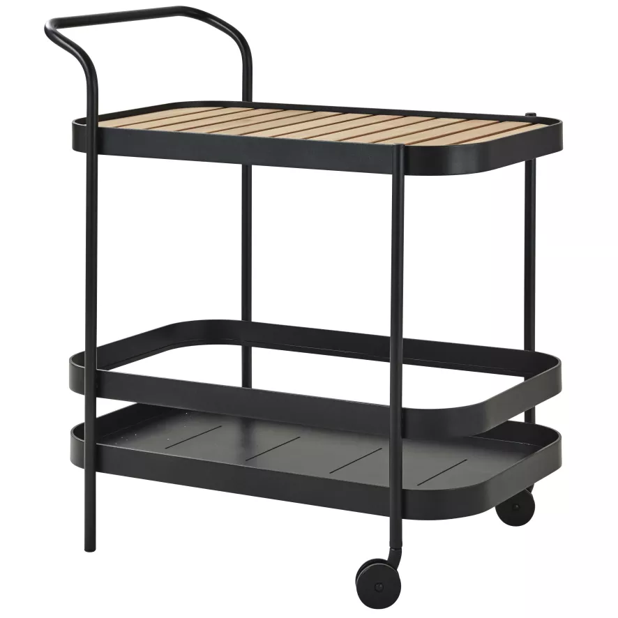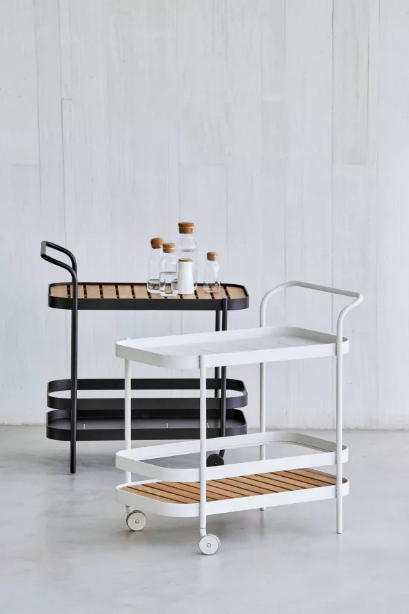 De Cane-Line Roll bartrolley is gemaakt van gepoedercoat aluminium en teak. De teakhouten latten kun je verplaatsen. De trolley is 49 centimeter breed. Hij is 78 centimeter diep en 85 centimeter hoog. Er zijn twee kleuren beschikbaar: wit en zwart.
