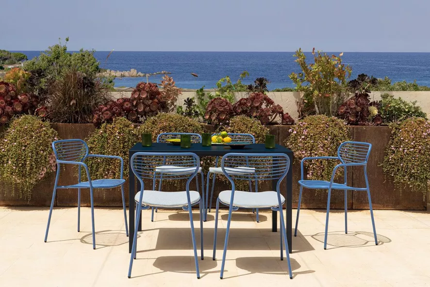 De Apero tuinstoel met armleuning van EMU is ontworpen door Martin Drechsel. De stoel heeft een breedte van 55,5 centimeter, een diepte van 52 centimeter en een hoogte van 78 centimeter. De zithoogte bedraagt 45 centimeter. De tuinstoel is gemaakt van staal, afgewerkt met een kataforese- en poedercoatbehandeling en is verkrijgbaar in verschillende kleuren. De Apero tuinstoel weegt 5,9 kilogram en heeft een maximaal draaggewicht van 200 kilogram. Je kan zes tuinstoelen stapelen. EMU raadt aan de tuinstoel in de wintermaanden beschut op te bergen.
