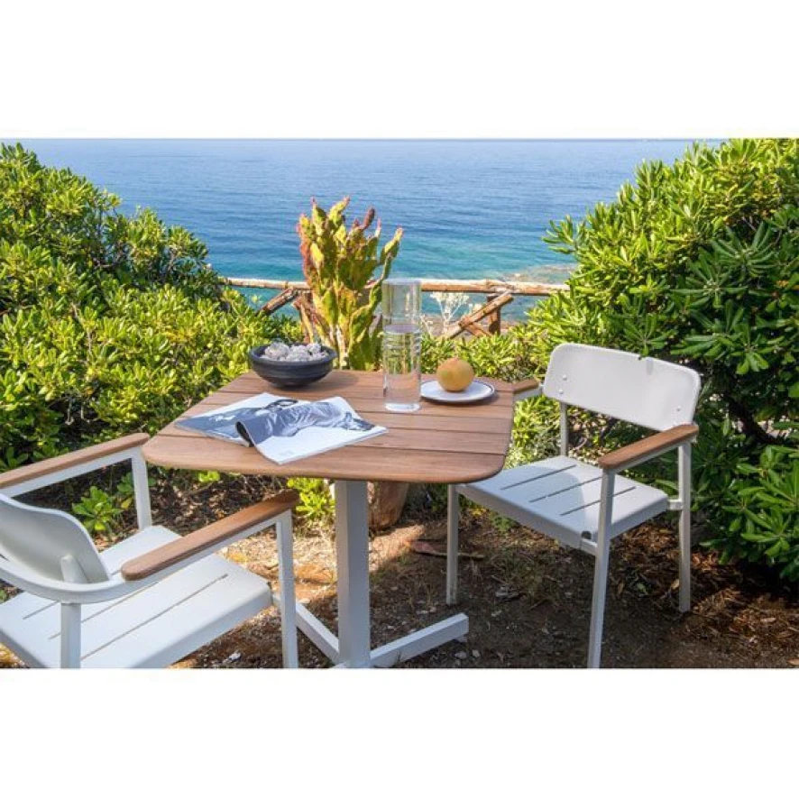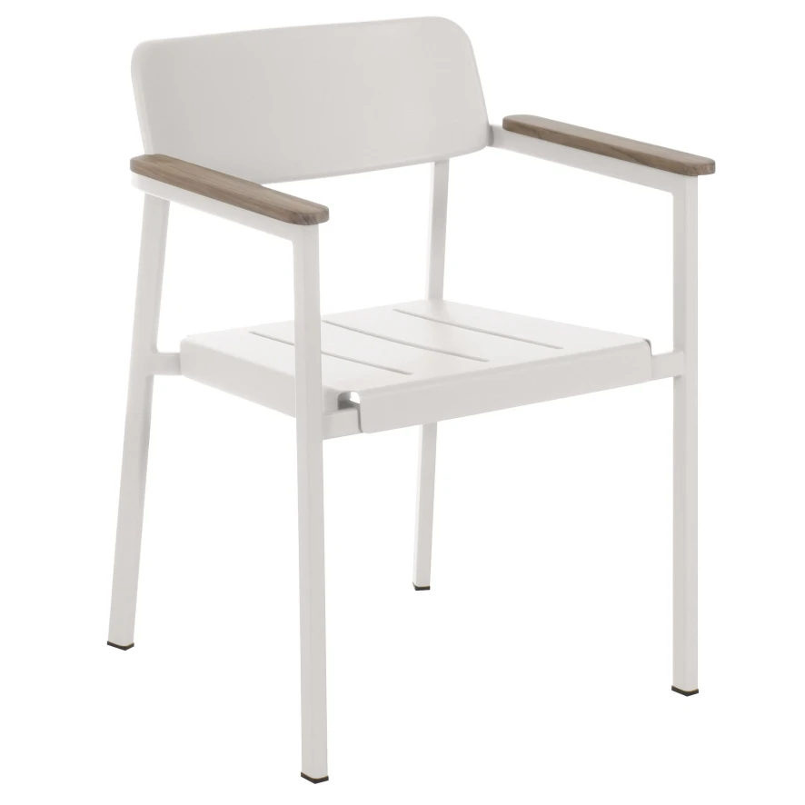 De Shine Armchair tuinstoel van Emu is 60 centimeter breed, 57 centimeter diep en 78 centimeter hoog. De zithoogte is 45 centimeter en de hoogte van de armleuningen is 67 centimeter. De stoel is gemaakt van gekleurd aluminium waardoor hij zeer goed weerbestendig is. De armleuningen zijn van teak. De stoelen kunnen per vier gestapeld worden en hebben een draagkracht van 100 kilo.