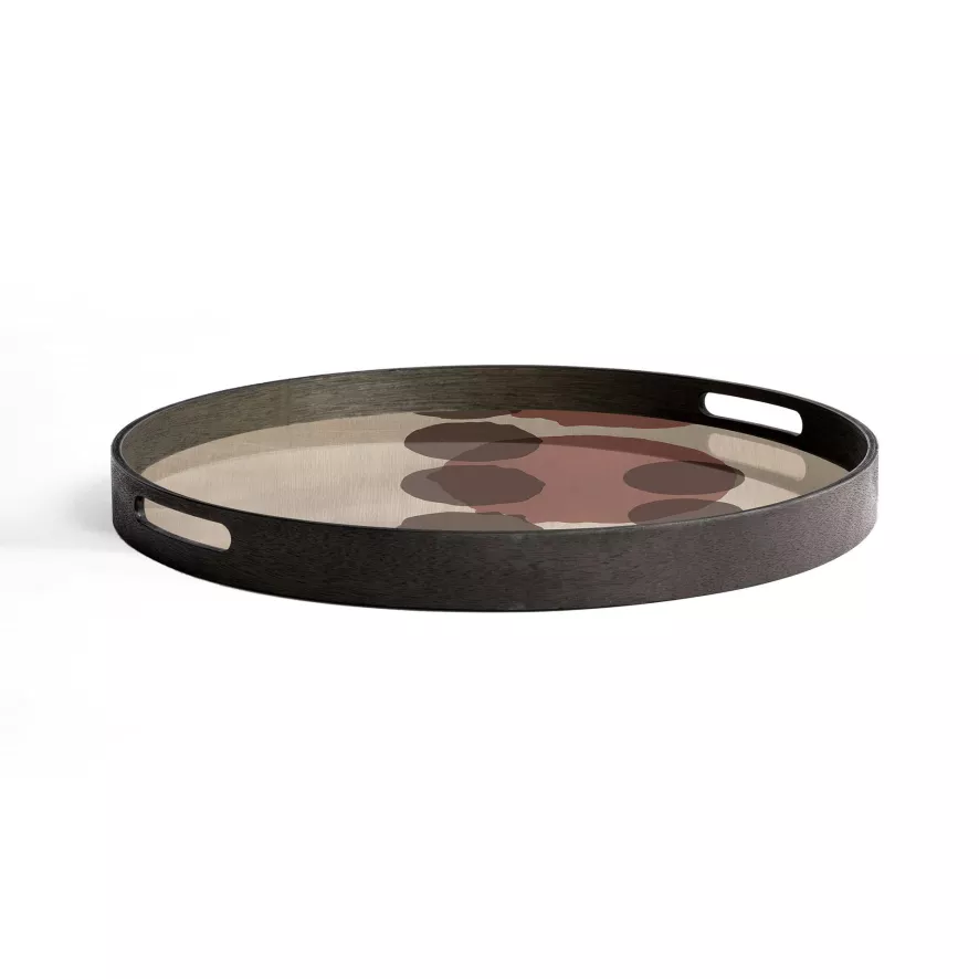Het Layered Dots dienblad pinot 48 van Ethnicraft heeft een diameter van 48 centimeter en een hoogte van 4 centimeter. Het dienblad heeft een houten frame en een glazen blad dat met de hand beschilderd en gezeefdrukt is. Het dienblad kan hierdoor enigszins afwijken van de getoonde afbeelding. Dit dienblad heeft een gewicht van 1,95 kilogram en heeft een maximum draaggewicht van 4,5 kilogram.