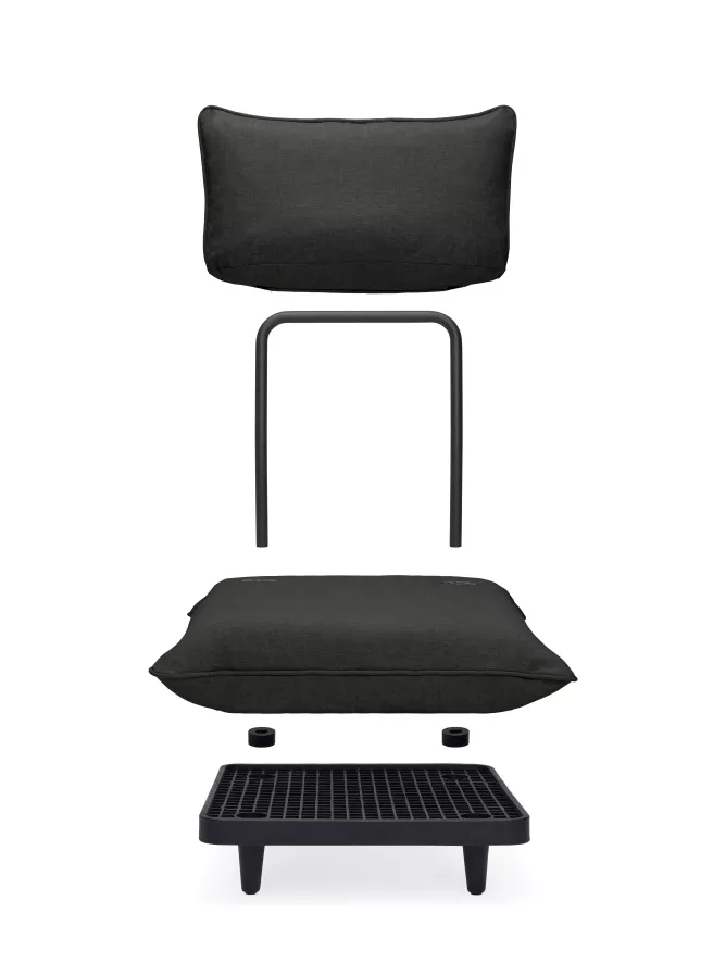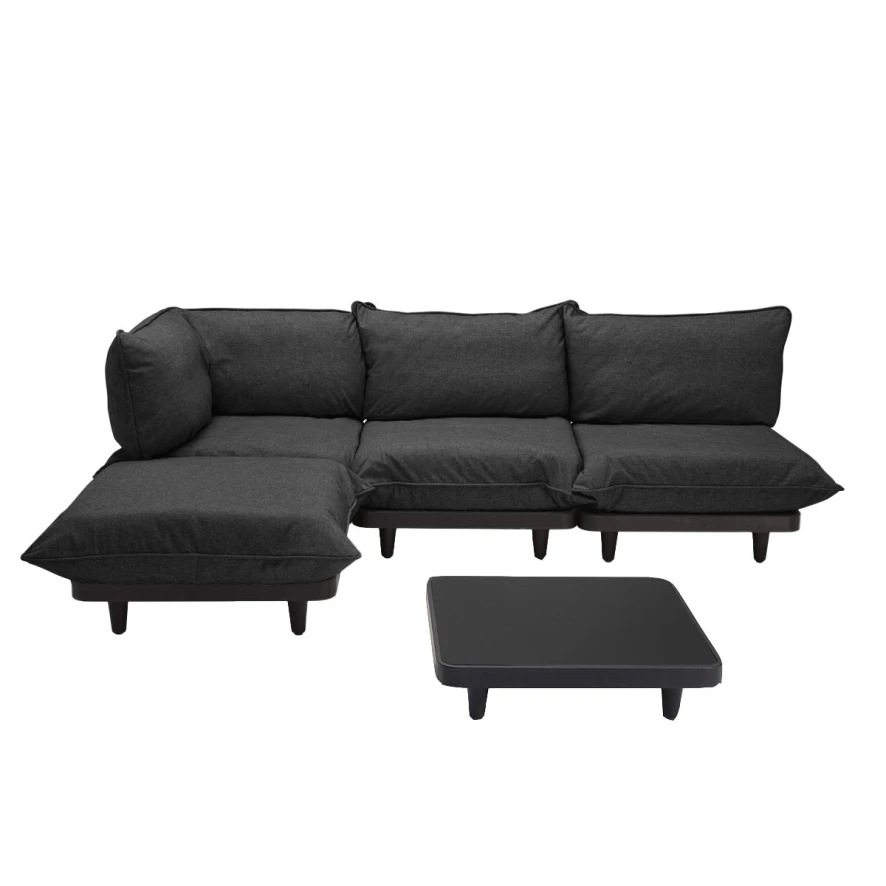 De Paletti loungeset 3-zits loungebank thunder grey + salontafel anthracite van Fatboy bestaat uit 5 losse onderdelen. Het hoekstuk en middenstuk (2 stuks) zijn 90 centimeter lang, 90 centimeter en 90 centimeter hoog. Het eindstuk, dat ook kan dienen als hocker, heeft een lengte van 90 centimeter, een breedte van 90 centimeter en een hoogte van 45 centimeter. De antracieten salontafel heeft een lengte van 90 centimeter, een breedte van 90 centimeter en een totale hoogte van 22,5 centimeter. De tafel is gemaakt van acryl en is afgewerkt met een Axalta coating die ervoor zorgt dat de tafel Uv-bestendig, waterbestendig en vlekbestendig is. Hierdoor kun je de tafel zowel buiten als binnen plaatsen. Het totaalgewicht van deze tafel is 14,36 kilogram.