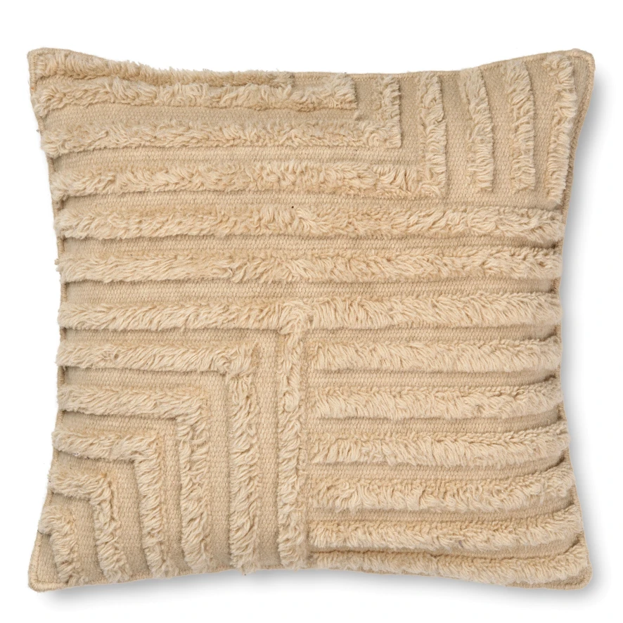 De kussenhoes is gemaakt van 100% Nieuw-Zeelands wol. De binnenkant van het kussen bestaat uit veren. Het kussen is met de hand geweven en met de hand getuft. Het kussen is 50 bij 50 centimeter.
