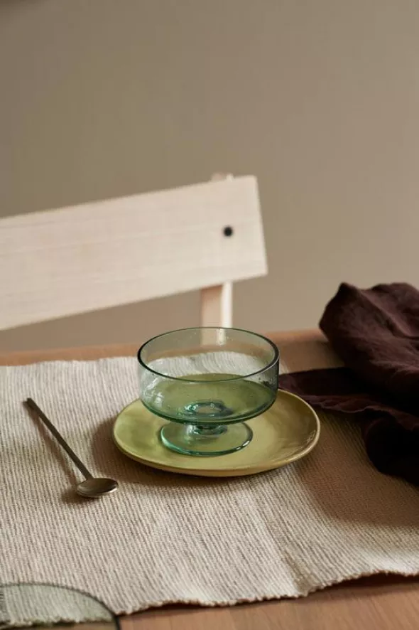 Het Oli desert glas van Ferm Living heeft een diameter van 10 centimeter en een hoogte van 6,4 centimeter. Het glas is gemaakt van 100% gerecycled, mond geblazen glas met bubbels. Het bubbel glas is vaatwasser bestendig.