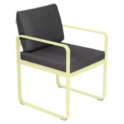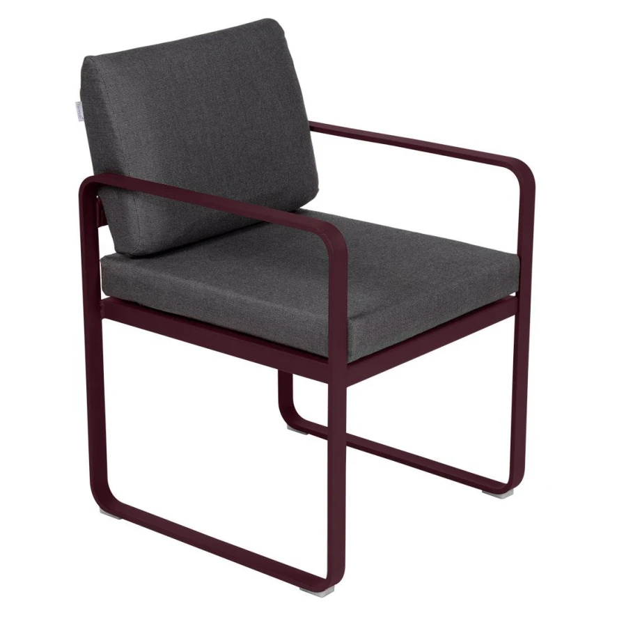 De Bellevie Dining Armchair tuinstoel kussen antraciet van Fermob is ontworpen door Pagnon en Pelhaître. De tuinstoel heeft een breedte van 55,5 centimeter, een diepte van 59 centimeter en een hoogte van 83 centimeter. De zithoogte bedraagt 39,5 centimeter, de zitbreedte 48 centimeter. De kussens zijn 8,5 centimeter dik en de afstand tussen het kussen en de armleuning bedraagt 15,5 centimeter. Het frame is gemaakt van aluminium, afgewerkt met een uv-bestendige poedercoating. De kussens zijn bekleed met een sterke Sunbrella stof. Deze is waterafstotend, uv-bestendig en anti-vlek en -schimmel. Daarnaast drogen de kussens snel en zijn ze resistent tegen scheuren. Je kan de kussenhoes reinigen op een dertig graden was in de wasmachine. Fermob raadt aan de kussens tijdens slecht weer binnen op te bergen.De stoel weegt 10 kilogram.