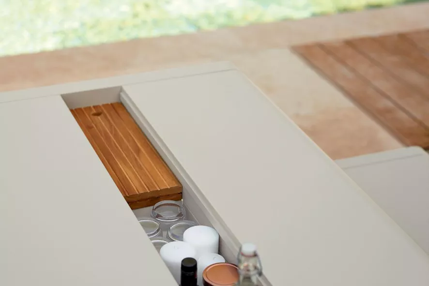 De tuintafel 196×90 met opbergruimte van Fermob is ontworpen door Pagnon en Pelhaître. De tuintafel heeft een lengte van 196 centimeter, een breedte van 90 centimeter en een hoogte van 74 centimeter. De afstand tussen de poten in de lengte bedraagt 184 centimeter. Het tafelblad is voorzien van opbergruimte; deze heeft een breedte van 16,5 centimeter en een lengte van 196 centimeter. De tafel is gemaakt van gepoedercoated aluminium en is voorzien van vier teak houten deksels. Hierdoor krijg je opbergruimte in het tafelblad. De Bellevie tafel weegt 35 kilogram en is verkrijgbaar in verschillende kleuren.