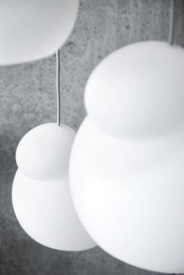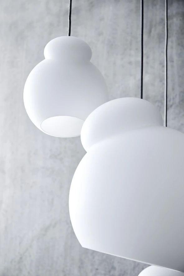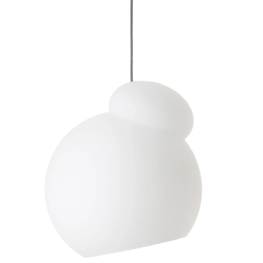 Deze hanglamp is gemaakt van opaal glas. Hij heeft een diameter van 34 centimeter en een hoogte van 39 centimeter. Het snoer aan de lamp is 300 centimeter lang. In de lamp zit een E27 fitting, geschikt voor een LED lichtbron met een maximaal wattage van 25. Deze lichtbron wordt niet meegeleverd. Van deze lamp is ook een kleine versie en een medium versie beschikbaar.