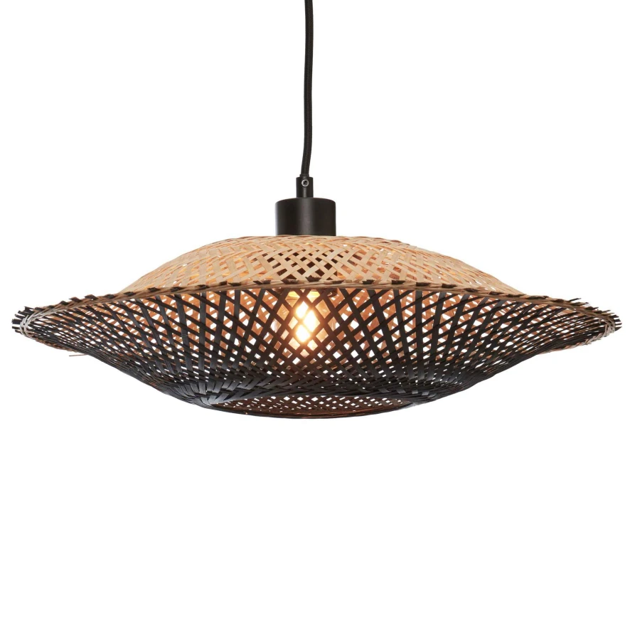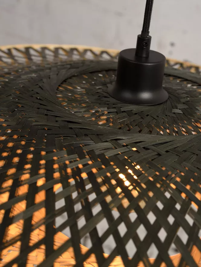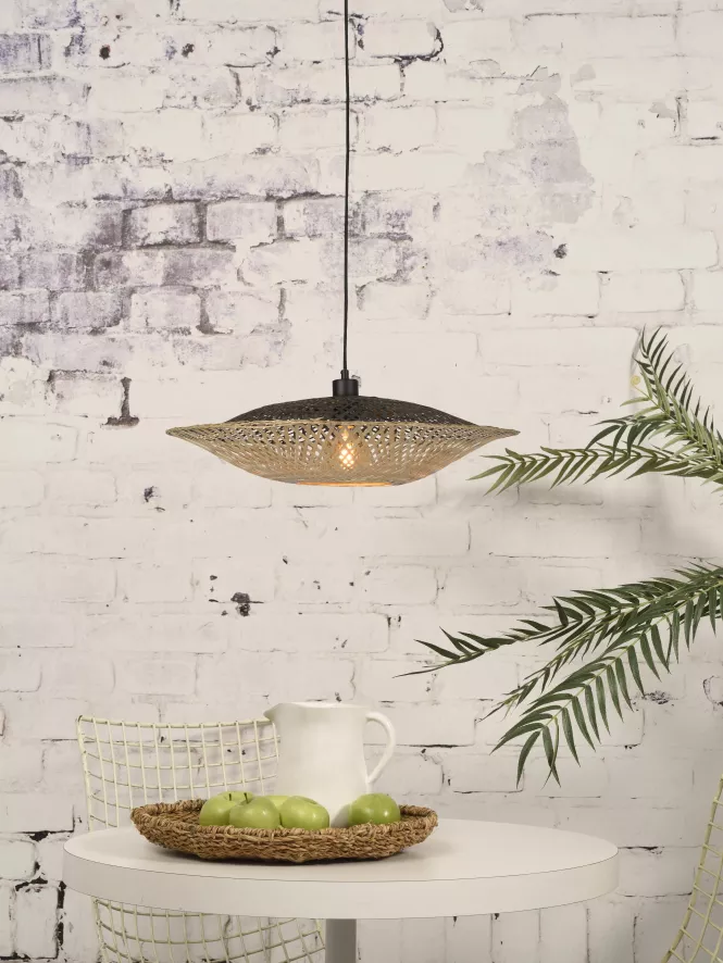 Deze hanglamp is gemaakt van ijzer en bamboe. In de lamp zit een E27 fitting, geschikt voor een lichtbron met een maximaal wattage van 40. Deze lichtbron wordt niet meegeleverd. De lampenkap heeft een diameter van 44 centimeter en is 12 centimeter hoog. Het snoer aan de lamp is 200 centimeter lang. De hanglamp is in verschillende maten beschikbaar.