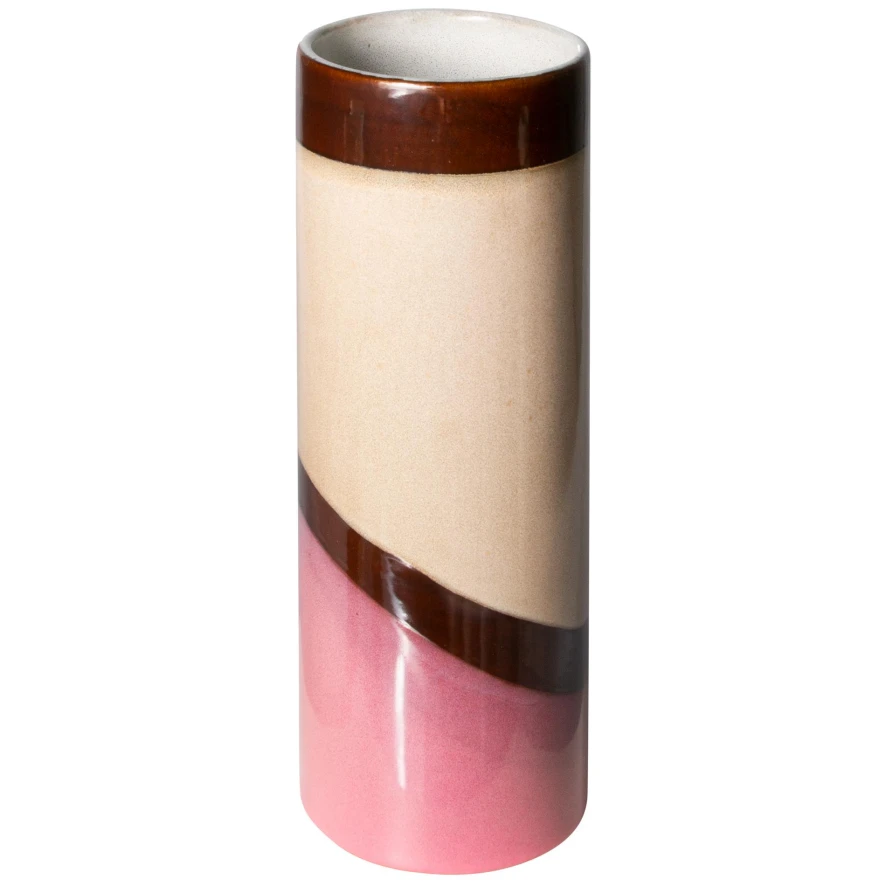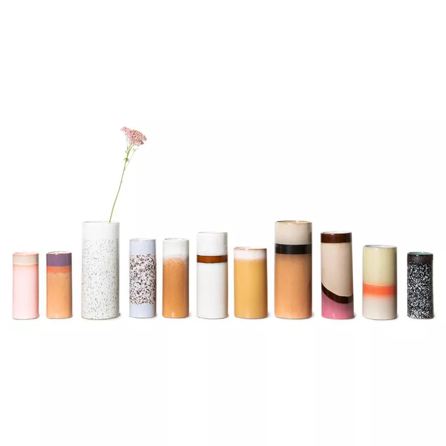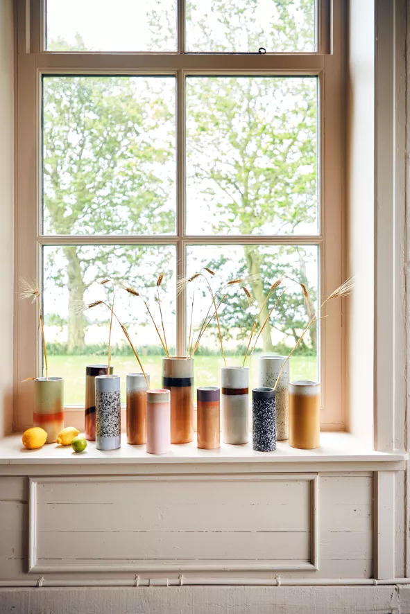 De 70’s Ceramic vaas L van HKliving heeft een diameter van 9,5 centimeter en een hoogte van 25 centimeter. De vaas weegt 960 gram en heeft een inhoud van 1460 milliliter. De vaas is gemaakt van keramiek met een laag reactief glazuur er overheen. Hierdoor kan het zijn dat er kleine verschillen per vaas zijn. Elke vaas is dus uniek. De vaas is in verschillende kleurenvariaties verkrijgbaar.