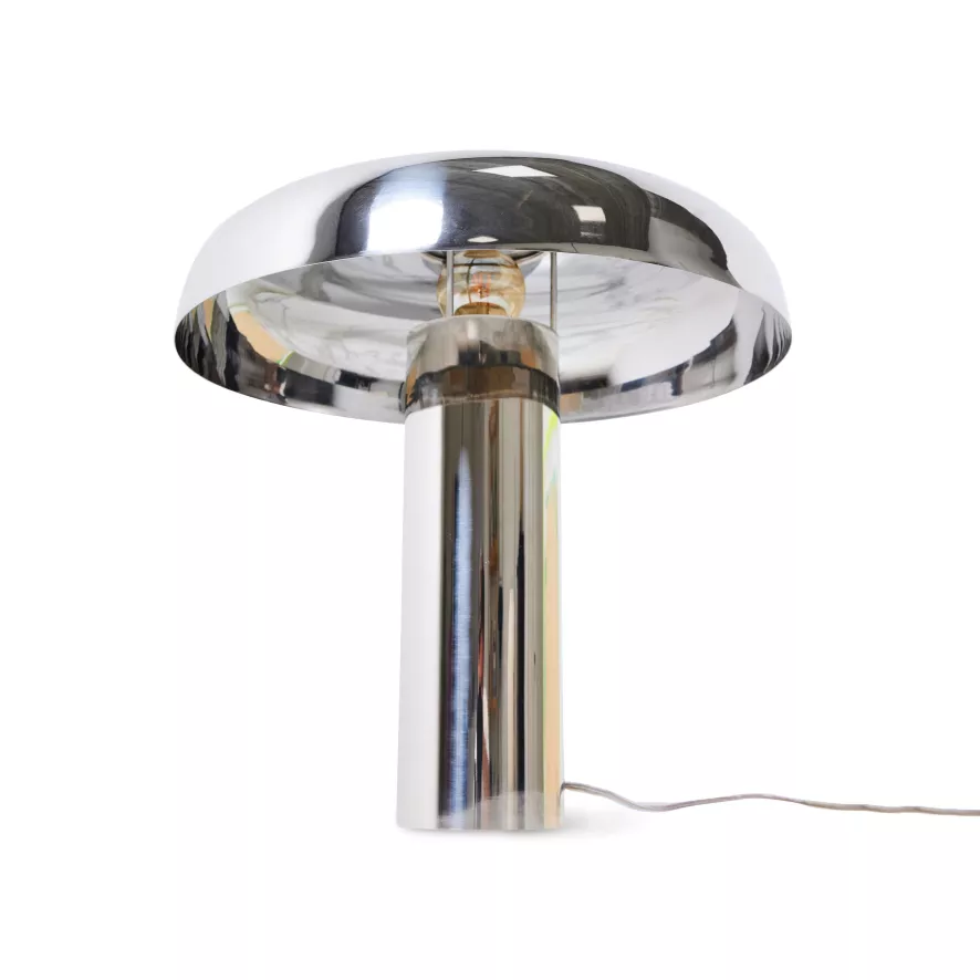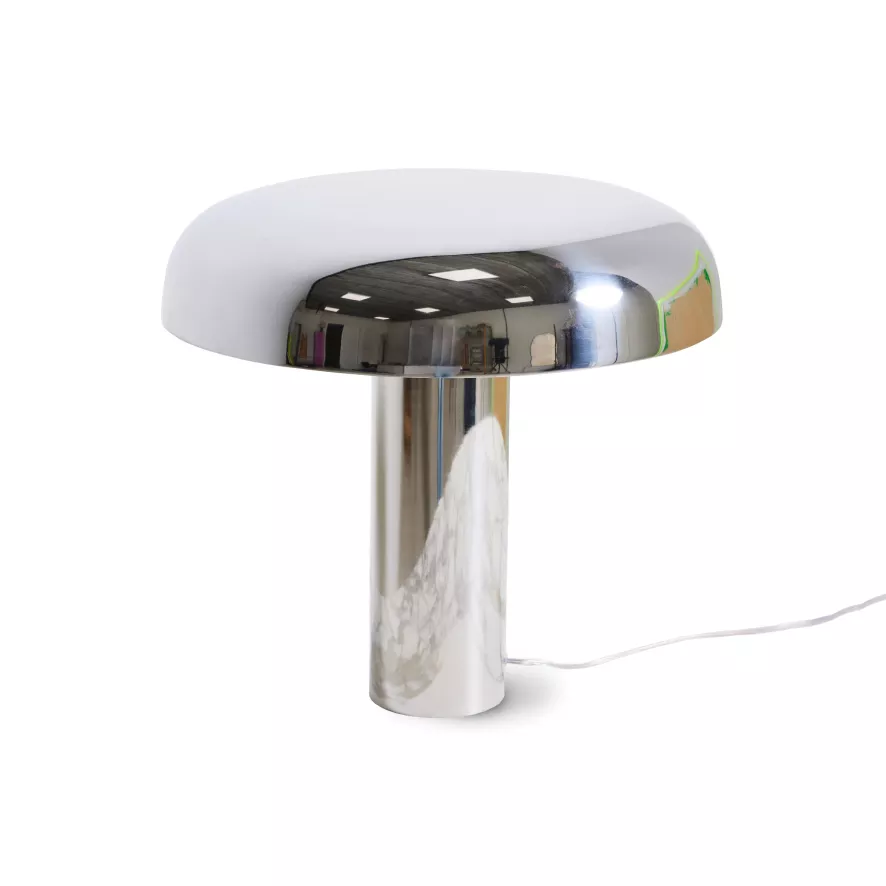 De Mushroom tafellamp chrome van HKliving heeft een diameter van 39 centimeter en een hoogte van 38 centimeter. De lamp is gemaakt van staal (RVS304). De tafellamp heeft een transparant snoer van 190 centimeter, voorzien van een aan-/uitschakelaar en een Europese stekker. De lamp heeft een E27 fitting met een maximale Wattage van 40.