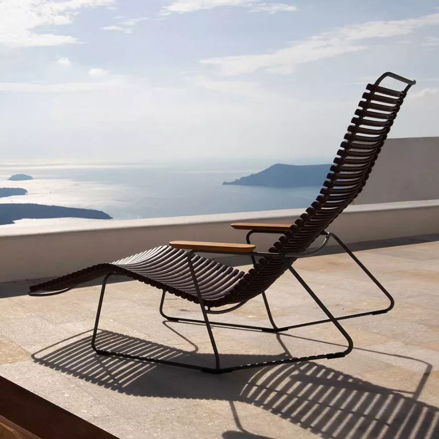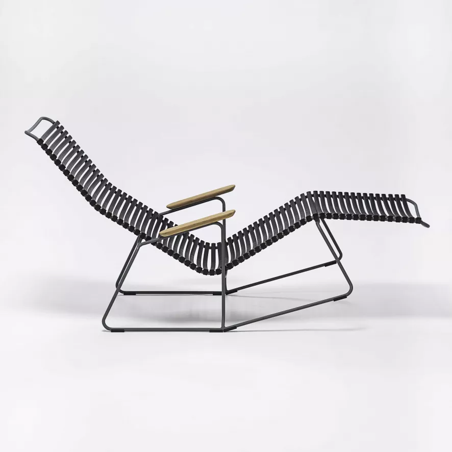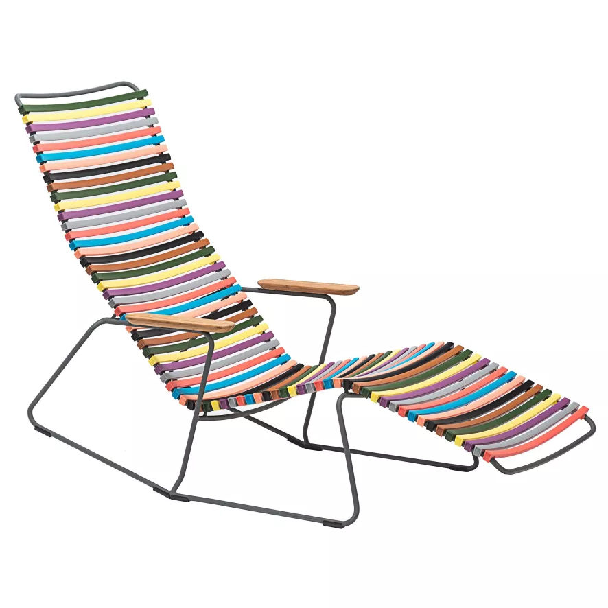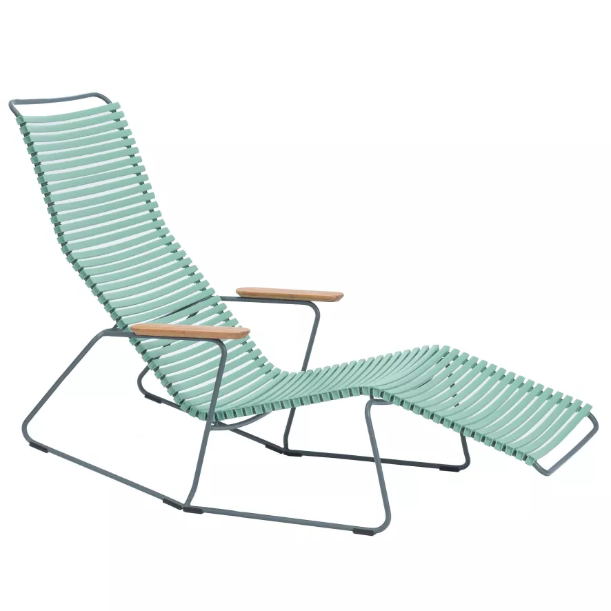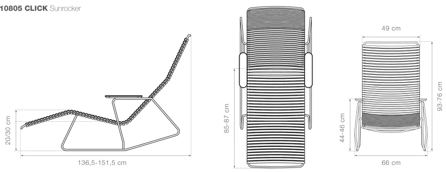 De Click Sunrocker ligstoel van Houe is 90 centimeter hoog, 64 centimeter breed en 180 centimeter lang. De zithoogte is 32 centimeter. Het frame van de stoel is gemaakt van gepoedercoat metaal, de lamellen zijn van plastic. Als je de kleur van de lamellen zat bent, kun je ze gemakkelijk loshalen en vervangen door een andere kleur. De armleuningen zijn gemaakt van bamboe. Maak de stoel schoon met een natte doek of een zachte borstel, en gebruik geen agressieve schoonmaakmiddelen. De bamboe vereist wat meer aandacht: behandel deze delen af en toe met olie (aan het begin, vier weken later en vervolgens 3 tot 4 keer per jaar), en lees bij het ontstaan van schimmel de gebruiksaanwijzing. De stoel is verkrijgbaar in verschillende kleuren.