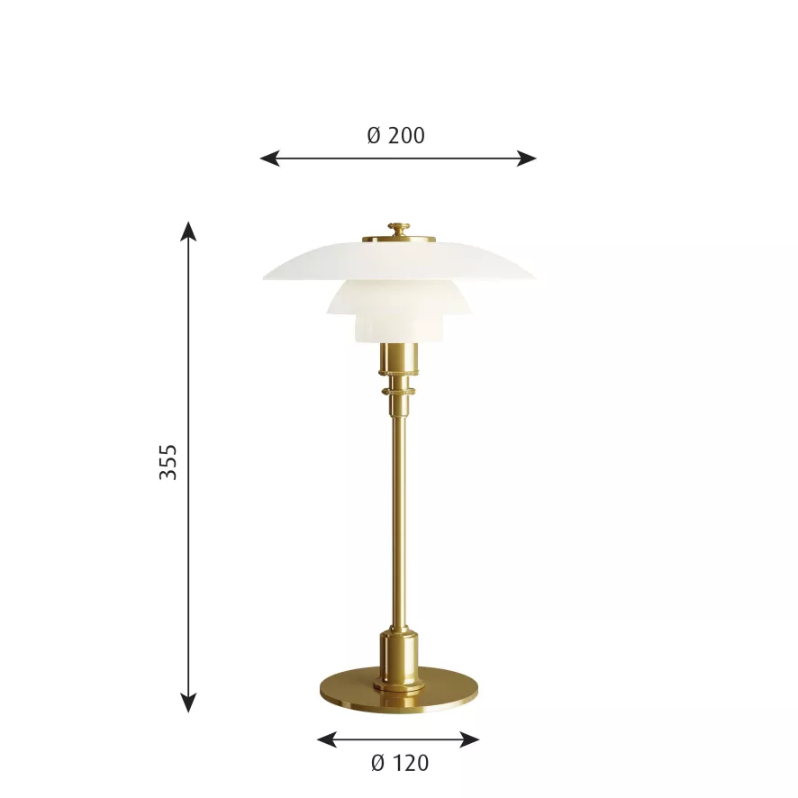 De voet van de PH 2/1 tafellamp van Louis Poulsen heeft een diameter van 12 centimeter, de kap heeft een diameter van 20 centimeter. De hoogte van de lamp is 35,5 centimeter. De lamp is gemaakt van wit opaalglas en hoogglans verchroomd of zwart gemetalliseerd messing. De schakelaar zit op het zwarte, vinyl snoer dat 1,75 meter lang is. De tafellamp heeft een G9 fitting voor een lamp van maximaal 33 Watt.