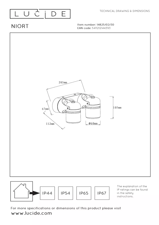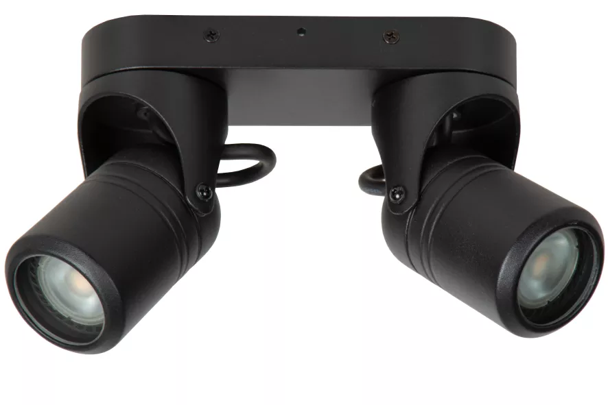 De Niort 2 spot buiten IP44 zwart van Lucide heeft een breedte van 20,5 centimeter, een diepte van 11,2 centimeter en een hoogte van 10,5 centimeter. De spots hebben ieder een diameter van 6 centimeter en een hoogte van 10,5 centimeter. De spot is gemaakt van aluminium met een mat zwarte afwerking en kan op een dimmer (extern) worden aangesloten. De spot heeft twee GU10-fittingen, geschikt voor een LED lichtbron met een maximaal energieverbruik van 6 Watt. De lichtbronnen worden niet meegeleverd. De spots zijn draaibaar en kantelbaar, zo bepaal je zelf de lichtrichting. Met een beschermingswaarde van IP44 is deze spot geschikt voor gebruik buitenshuis.