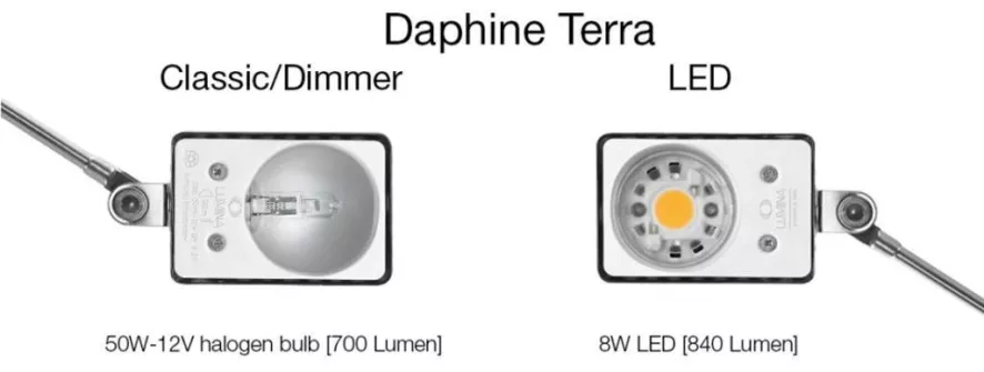 De Daphine Terra vloerlamp LED van Lumina heeft een basis van 21 bij 10 centimeter met daaraan twee beweegbare armen. De lengte arm heeft een lengte van 91 centimeter, de kortere arm heeft een lengte van 45 centimeter. Aan de kortere arm vind je de kop van de lamp met een lengte van 8 centimeter en een hoogte van 3,5 centimeter. Je kunt voor de vloerlamp kiezen uit verschillende kleuren: Black, White, Red, Yellow, Metallic Bronze en Brushed Nickel.