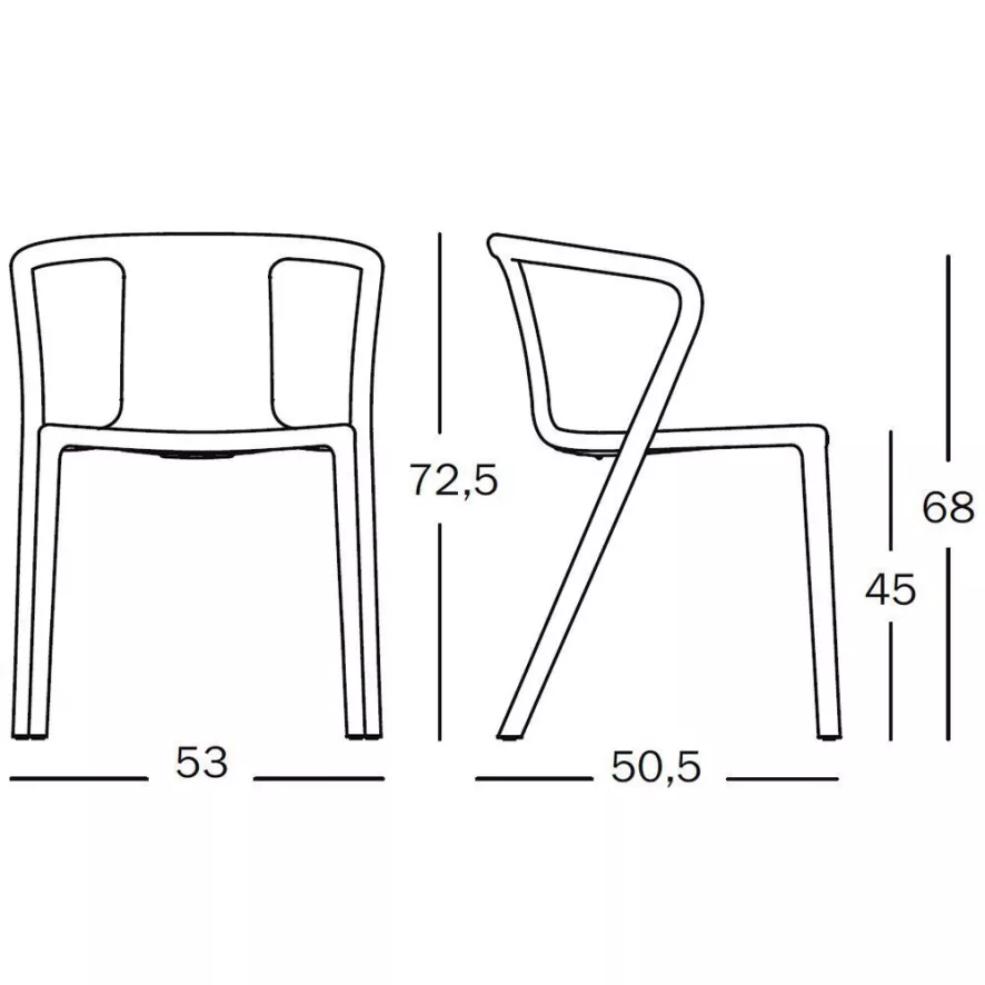 De Magis Air-Chair stoel is 53 centimeter breed en 50,5 centimeter diep. De hoogte van de stoel is 72,5 centimeter en de zithoogte is 45 centimeter. De stoel is gemaakt van glasvezel en polypropyleen en verkrijgbaar in de kleuren beige, fuchsia, grijs, groen, oranje en wit. Deze stoel is stapelbaar en dankzij de materiaalkeuze ook geschikt om buiten te gebruiken.