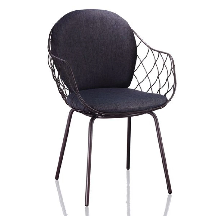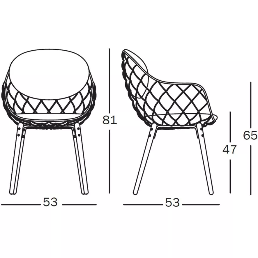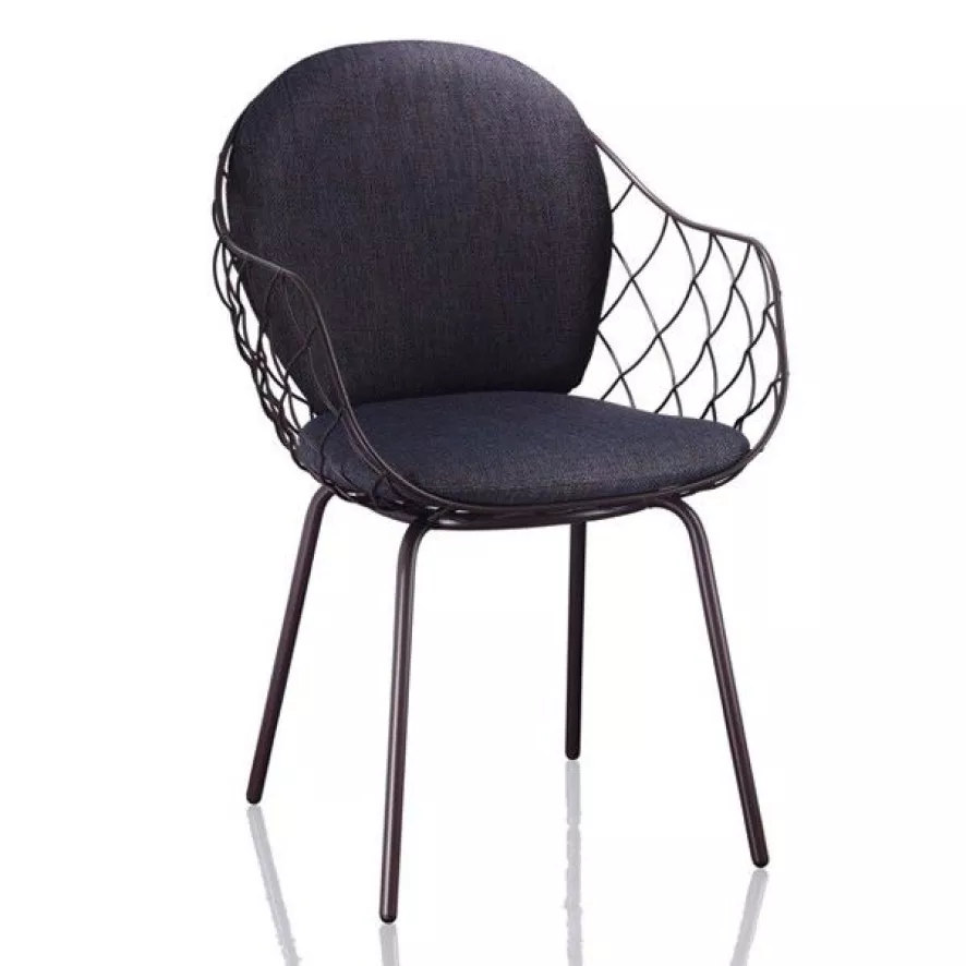 De Piña Armchair stoel met groot rugkussen van Magis heeft een onderstel van gepoedercoat staal en een kuip van draadstaal. Het zit- en rugkussen van de stoel zijn gemaakt van polyurethaan bekleed met Kvadrat stof. De beschikbare kleuren zijn: bruin en wit. De stoel heeft een hoogte van 81 centimeter, een breedte van 53 centimeter en een lengte van 53 centimeter. De zithoogte bedraagt 47 centimeter. Deze variant is ook geschikt voor buitengebruik.