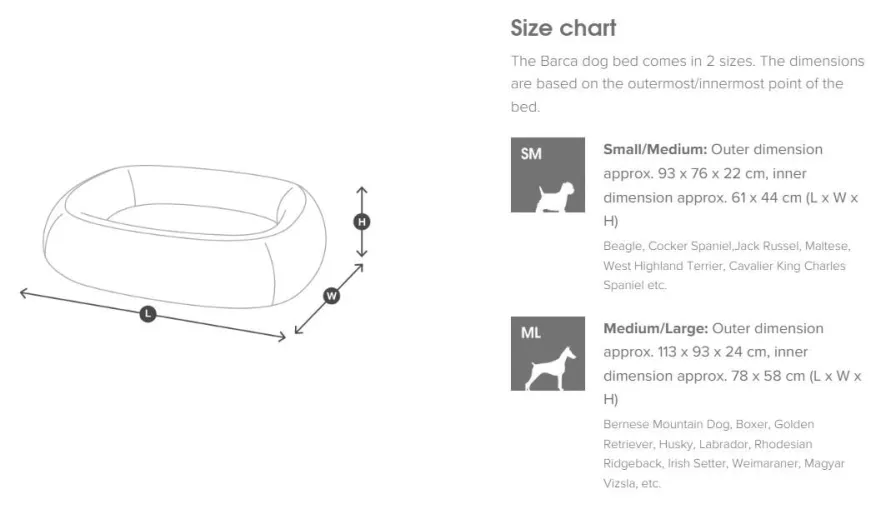 De MiaCara Barca hondenmand medium/large is ontworpen door Hans Thyge & Co. De Barca hondenmand medium/large van MiaCara heeft een lengte van 113 centimeter, een breedte van 93 centimeter en een hoogte van 24 centimeter. De hondenmand heeft een afneembare, wasbare hoes van Polyester Trevira CS die met stoom gereinigd mag worden of in de wasmachine tot 60 graden Celsius gewassen mag worden. Na het reinigen dient de hoes aan de lucht gedroogd worden. De hoes mag niet in de droogtrommel maar mag wel op lage temperatuur gestreken worden. De mand heeft een binnen kussen van katoen en polyester en is opgevuld met stabiel, duurzaam, hypoallergeen en elastisch polyurethaanvulling. De zijkanten van de mand zijn gemaakt van polyurethaan en koud schuim en zijn waterafstotend. Hierdoor kun je deze het beste met een vochtige doek afnemen. Deze hondenmand is geschikt voor Berner Sennenhonden, Boxers, Golden Retrievers, Husky’s, Labradors, Rhodesian Ridgebacks, Ierse setters, Weimarse staande honden, Magyar Vizsla’s en andere middelgrote tot grote hondenrassen. De Barca hondenmand medium/large van MiaCara is in verschillende kleuren en formaten verkrijgbaar.