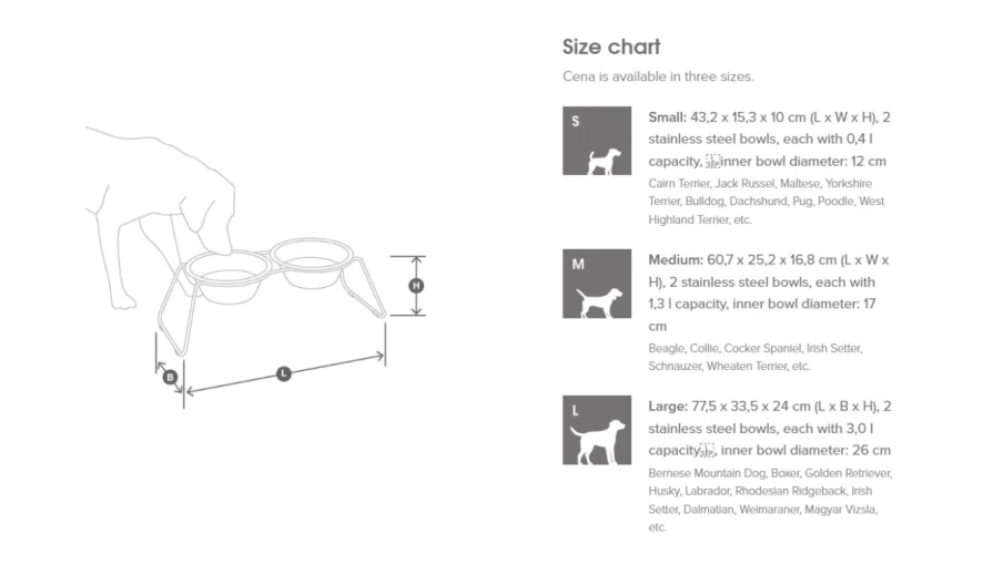 De Cena hondenvoerbak medium van MiaCara is 60,7 centimeter lang, 25,2 centimeter breed en 16,8 centimeter hoog. De hondenvoerbak is gemaakt van gepoedercoat metaal. De Cena hondenvoerbak heeft twee bakken van roestvrijstaal met beide een inhoud van 1,3 liter en plastic poten. De diameter van de binnenkant van een bak is 17 centimeter. De bakken zijn vaatwasserbestendig. Onder de bakken zit een siliconen ring die ervoor zorgt dat de bakken niet rinkelen. De Cena hondenvoerbak is verkrijgbaar in verschillende kleuren en maten. De Cena hondenvoerbak medium is geschikt voor middelgrote honden als een Beagle, Collie of Cocker Spaniel.
