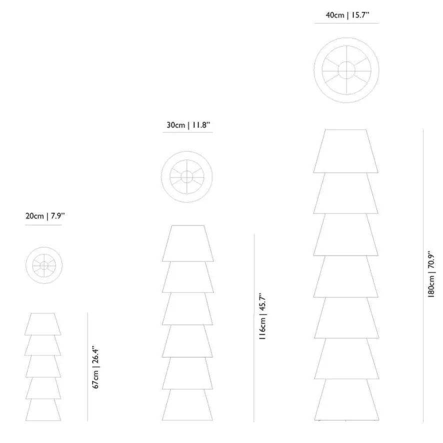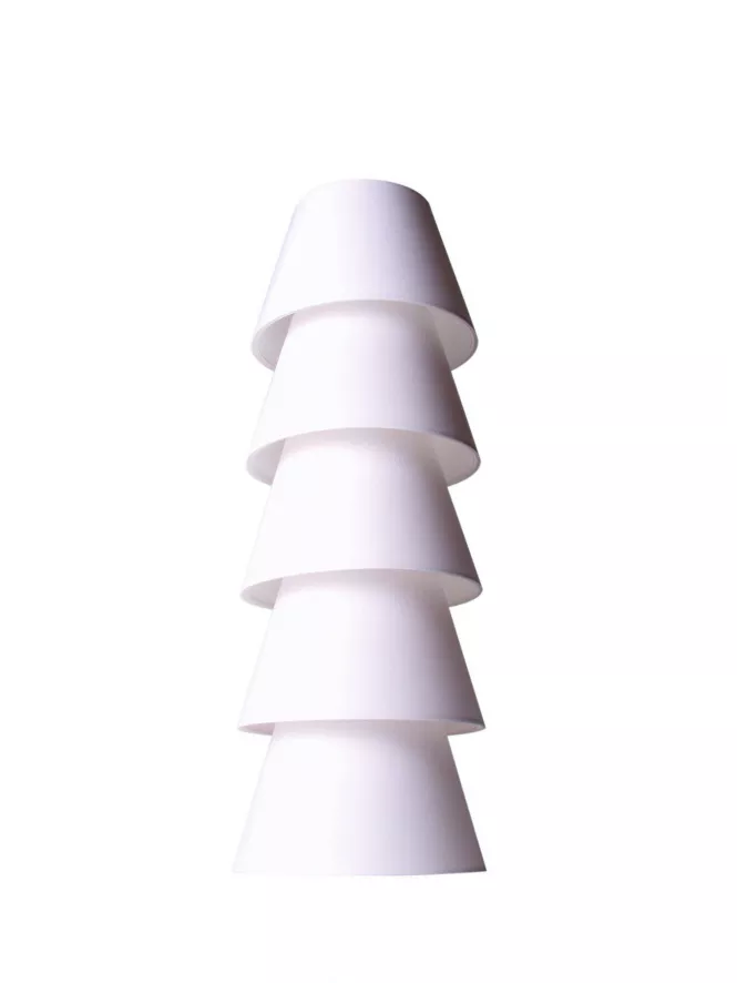 De Moooi Set up shade vloerlamp is verkrijgbaar in drie formaten. De Set up shade 5 is een stapel van vijf lampenkappen met een hoogte van 67 centimeter en een diameter van 20 centimeter. Deze maat heeft een E14-fitting en een zwart snoer dat 200 centimeter lang is. Set up shade 6 komt met zes lampenkappen en een hoogte van 116 centimeter en een diameter van 30 centimeter. De maat Set up shade 7 bestaat ui zeven lampenkappen, met een totale hoogte van 180 centimeter en een diameter van 40 centimeter. Maten Set up shade 6 en 7 hebben beide een E27-fitting en een zwart snoer met een lengte van 250 centimeter. De vloerlamp is gemaakt van kunststof op een metalen frame, de kleur is wit.