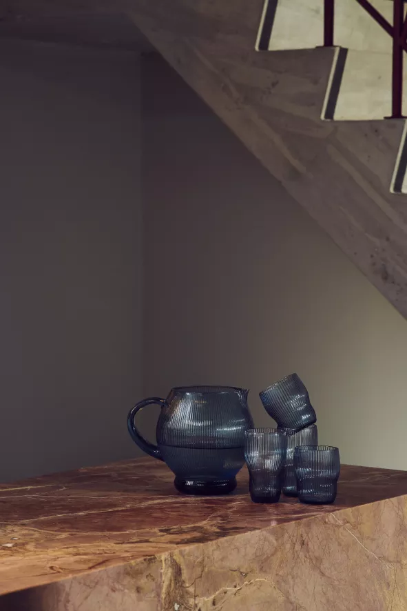 De Pum karaf van POLSPOTTEN is geribbeld en heeft een lengte van 23 centimeter, een breedte van 17,3 centimeter, een hoogte van 18 centimeter en een inhoud van 2 liter. De kan is gemaakt van glas en is verkrijgbaar in verschillende kleuren. De waterkan is vaatwasser bestendig en wordt in een cadeauverpakking geleverd.