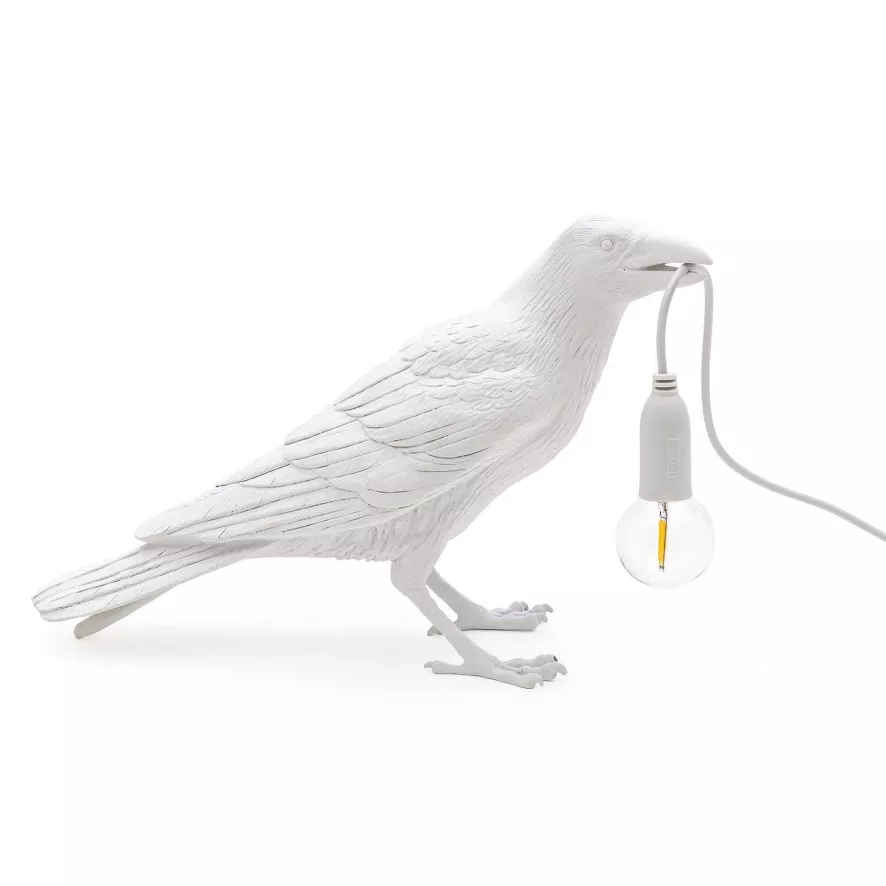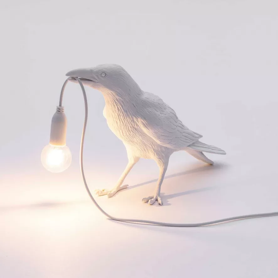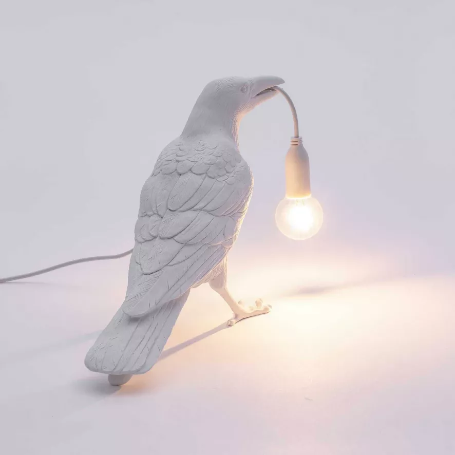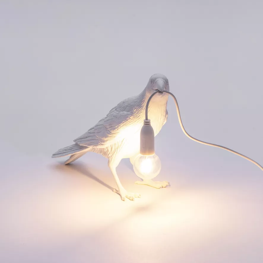 De Seletti Bird Waiting tafellamp is ontworpen door Marcantonio. De lamp is verkrijgbaar in twee kleuren: zwart en wit. De lamp is 29,5 centimeter breed, 12 centimeter diep en 18,5 centimeter hoog. De lamp wordt geleverd inclusief E14 lichtbron van 2 Watt. Deze heeft een lichtopbrengst van 180 Lumen en een kleurtemperatuur van 2700 Kelvin. Je bedient de Seletti Bird Waiting tafellamp buiten met de stekker, zonder schakelaar. Deze lamp is gemaakt van giethars.