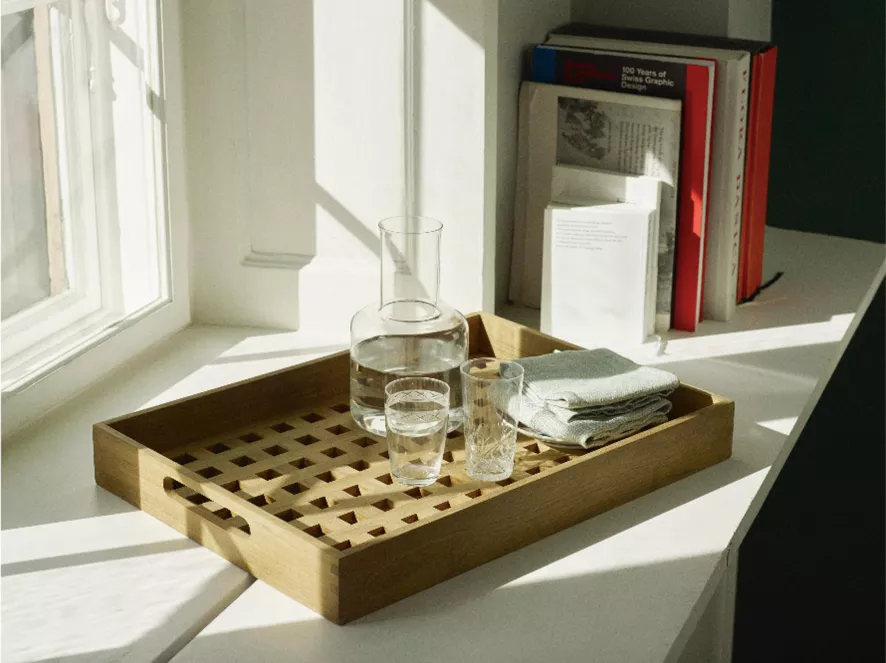 Het Skagerak Fionia dienblad heeft een afmeting van 52 centimeter bij 36 centimeter en een opstaande rand van 6 centimeter hoog. Het dienblad is gemaakt van eikenhout met een FSC-keurmerk of van Teak hout. Het eikenhout is onbehandeld en niet geschikt voor de vaatwasser. Liever een maatje kleiner? Dit dienblad is er ook met een afmeting van 48 x 32 centimeter.
